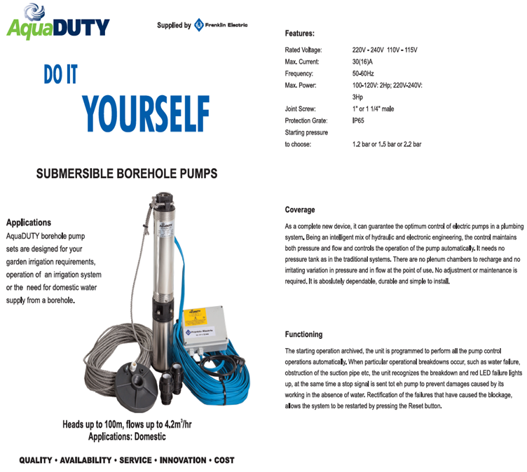 AquaDUTY® borehole pump sets are designed for your garden irrigation requirements, operation of an irrigation system or the need for domestic water supply from a borehole.