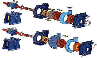 Removable high chrome, elastomer, ceramic and tungsten coated liners can be independently replaced, minimising maintenance costs Battlemax Pump Liner and Impeller Material have interchangeable wear part combinations. Top diagram is exploded view of Battlemax metal-lined International (IN) Pump and bottom diagram is exploded view of Battlemax elastomer-lined International (IN) Pump.